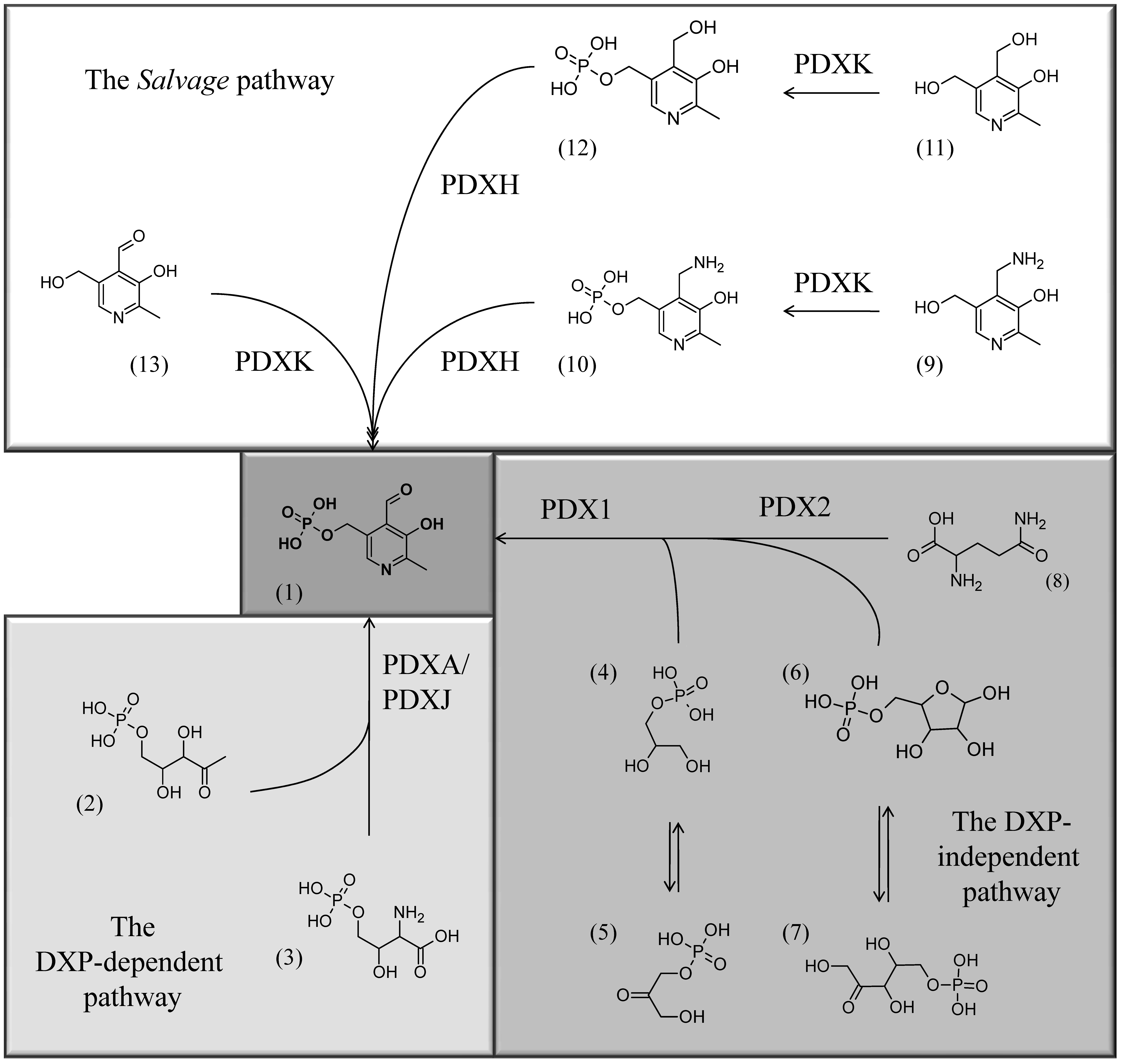 Fig.6: The three known pathways for PLP biosynthesis: one salvage pathway, and two de novo pathways, a Deoxyxylulose (DXP)-dependent one and a DXP-independent one (for more information see Mooney and Hellmann, 2010). Chemical structures: (1) PLP, (2) Deoxyxylulose 5’-phosphate, (3) 4-(Phosphohydroxy)-L-threonine, (4) Glyceraldehyde 3’-phosphate, (5) Dihydroxyacetone phosphate, (6) Ribose 5’-phosphate, (7) Ribulose 5’-phosphate, (8) glutamine, (9) PM, (10) PMP, (11) PN, (12) PNP, (13) PL.