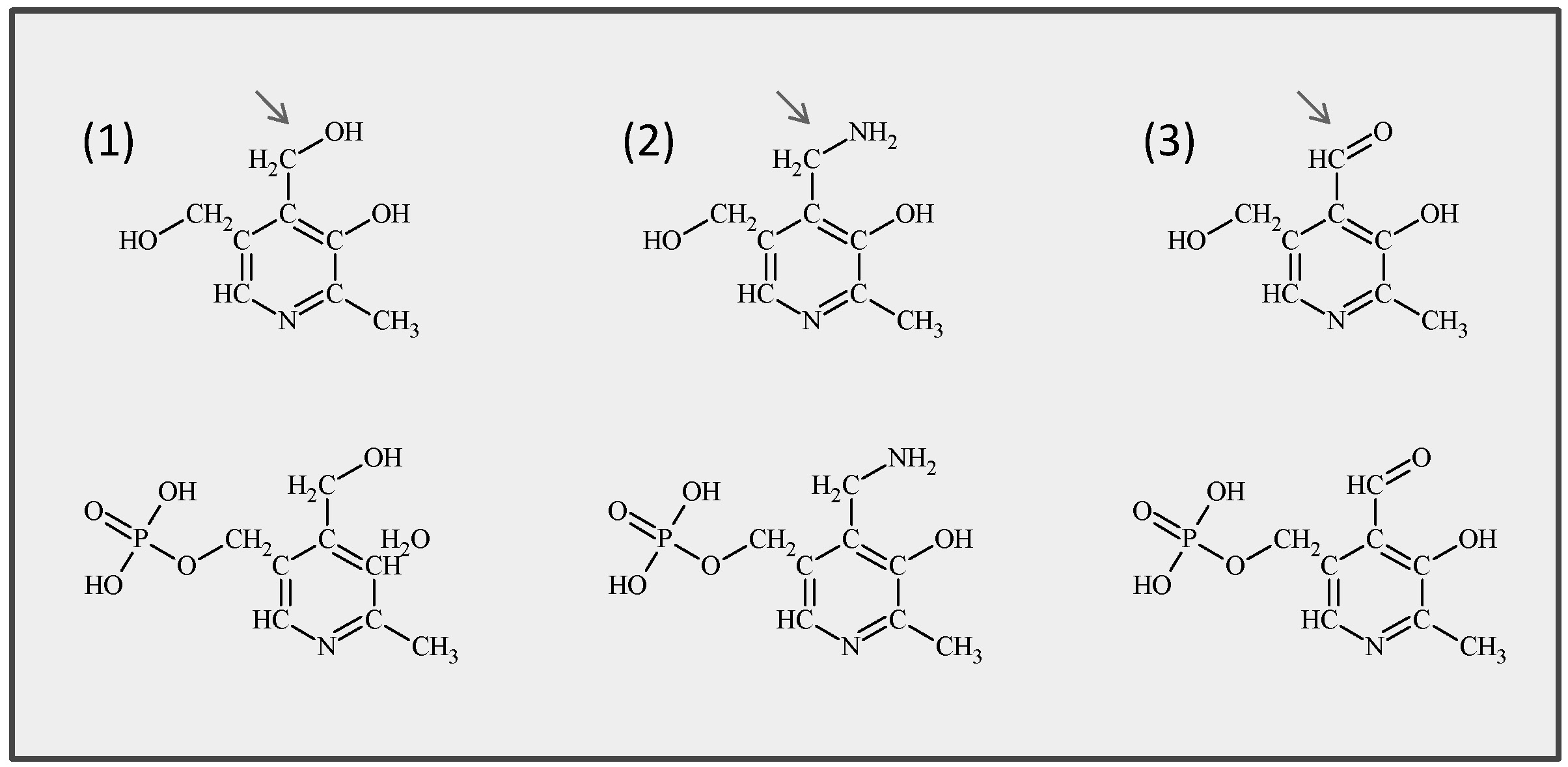 Fig. 5: Chemical structures of the six common B6 vitamers. (1) Pyridoxine and its phosphorylated form pyridoxine 5'-phosphate (PLP), (2) pyridoxamine and pyridoxamine 5'-phosphate, (3) pyridoxal and pyridoxal 5'-phosphate. Arrows indicate the variable group at the 4’ position.